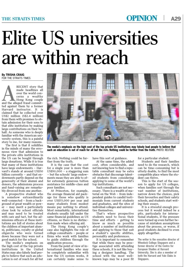 This is an op-ed I published today in the Straits Times.  It was motivated by a story that has gotten a lot of press around the world.  A wealthy Hong Kong couple were allegedly defrauded of more than $2 million by a college consultant promising that he could obtain admission to Harvard for their children if he made large donations to the university on their behalf.